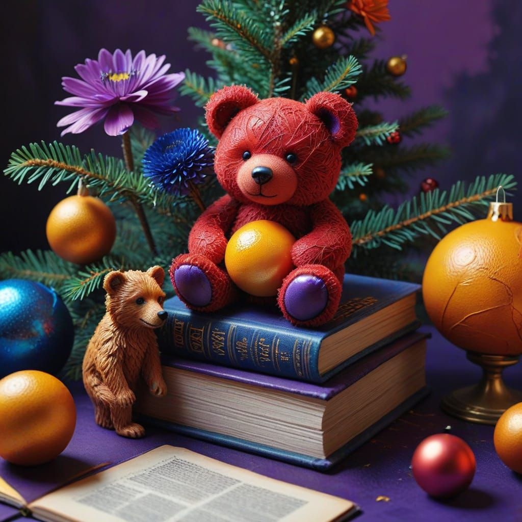 This image is a photorealistic collage featuring a red ball, blue bear, purple flower, orange, yellow book, and Christmas tree. It has sharp details, vibrant colors, and dynamic lighting.