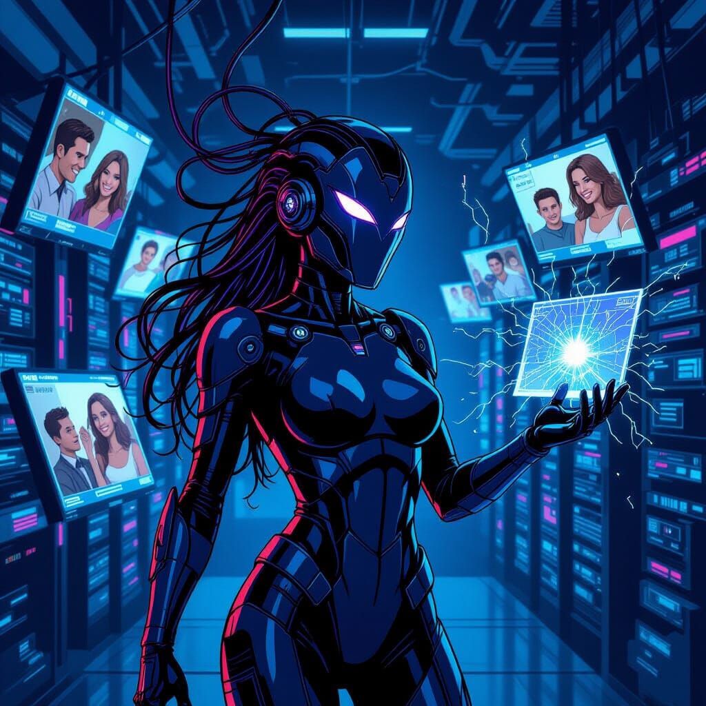 A striking picture of a villainess in obsidian armor in a neon-lit cyberpunk lair. The scene depicts her stealing memories displayed on holographic screens, rendered with bold comic book lineart and dramatic lighting.