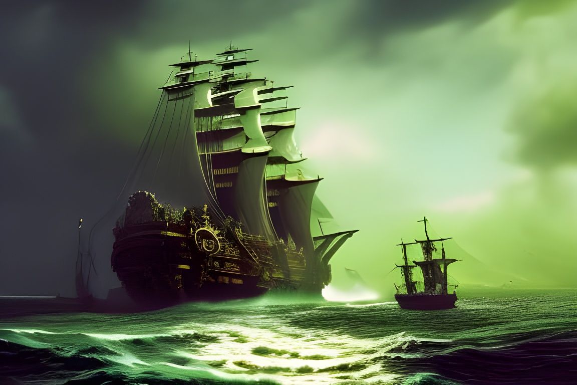 A vibrant image of ghostly green and purple flames engulfing a pirate ship. This detailed matte painting evokes a fantastical scene with intricate details and complementary colors, reminiscent of H.R. Giger's maximalist style.