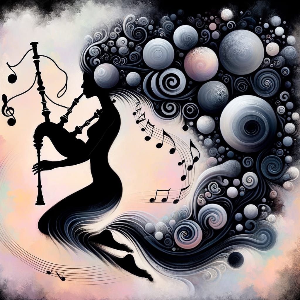 A delicate, African-inspired female figure composed of a fluid black silhouette plays the bagpipes amidst a surreal dreamscape of spherical flowers and floating musical notes.