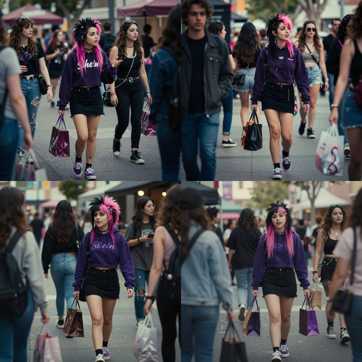 Cinematic film still of a young punk girl with black and pink hair, wearing a purple hoodie, black skirt, and purple Vans, shopping with friends. Atmospheric, film grain, and color graded.