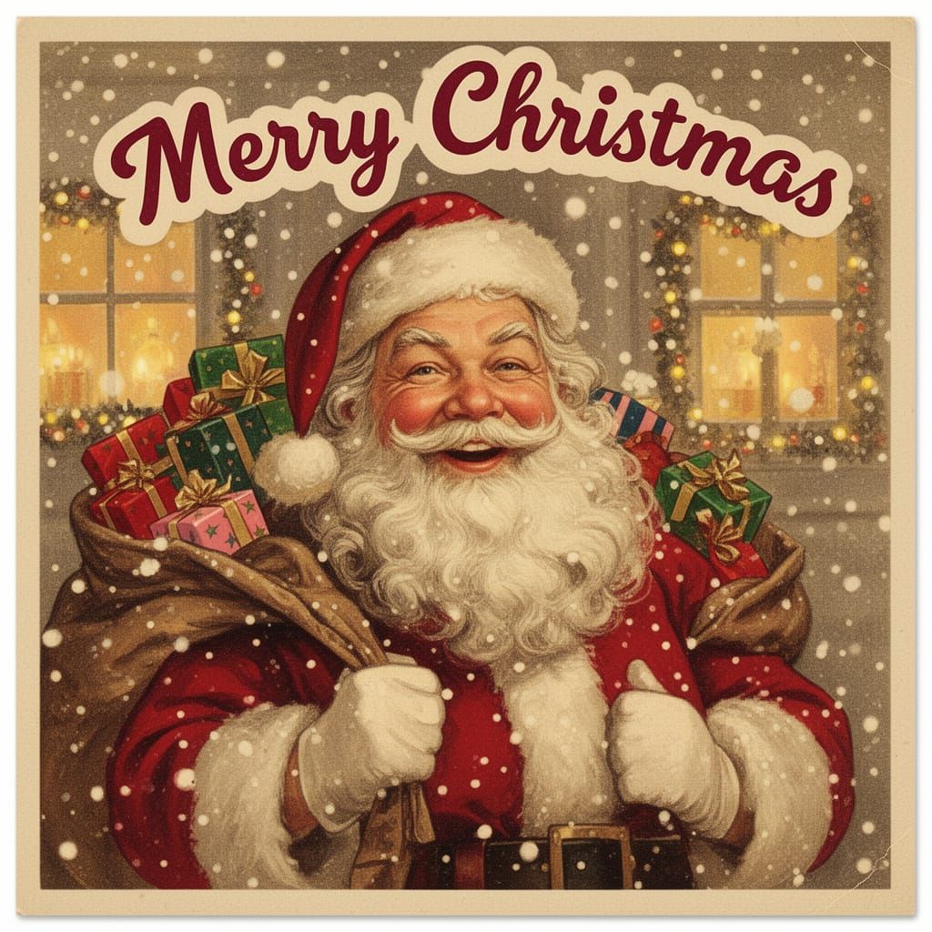 "Vintage card featuring a smiling Santa Claus carrying a sack of gifts, surrounded by snow and warm lights, with a retro handwritten message that says 'Merry Christmas'.