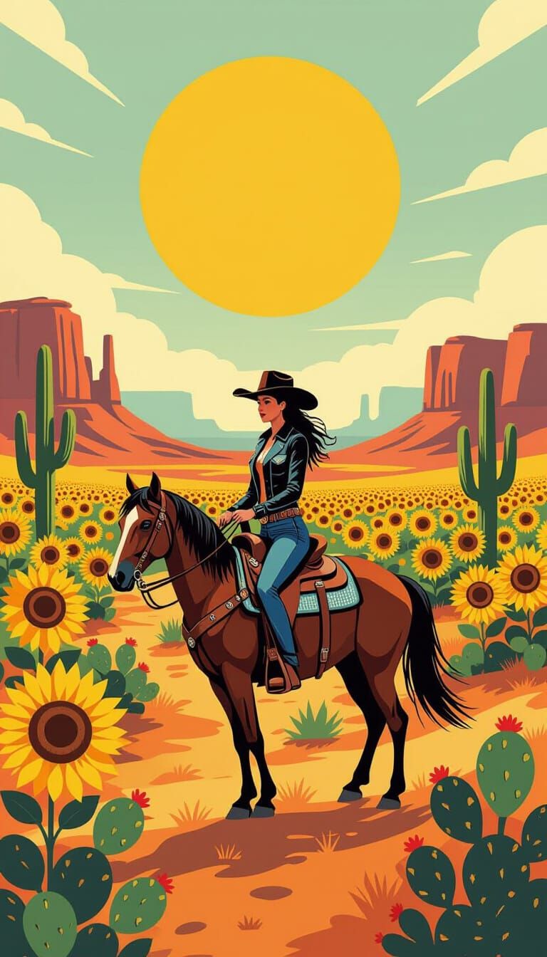This image shows a cowgirl in the Wild West riding a horse. The art style features bold lines, vibrant colors, simple geometric shapes, and whimsical forms with tactile textures, reminiscent of classic cartoons.