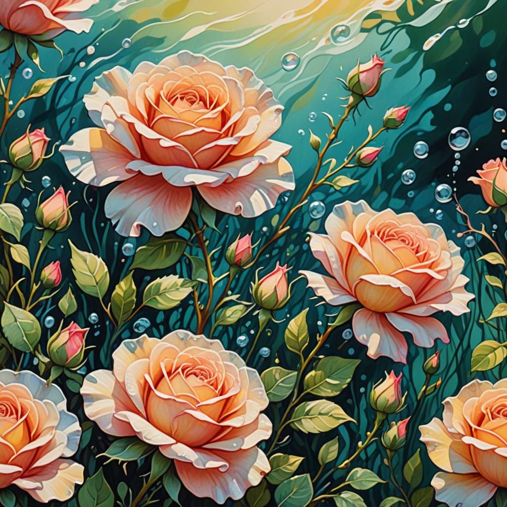 This image shows a close-up of roses in an underwater garden. Soft petals and delicate seaweed sway in the warm sunlight, illustrated in a whimsical gouache painting style.
