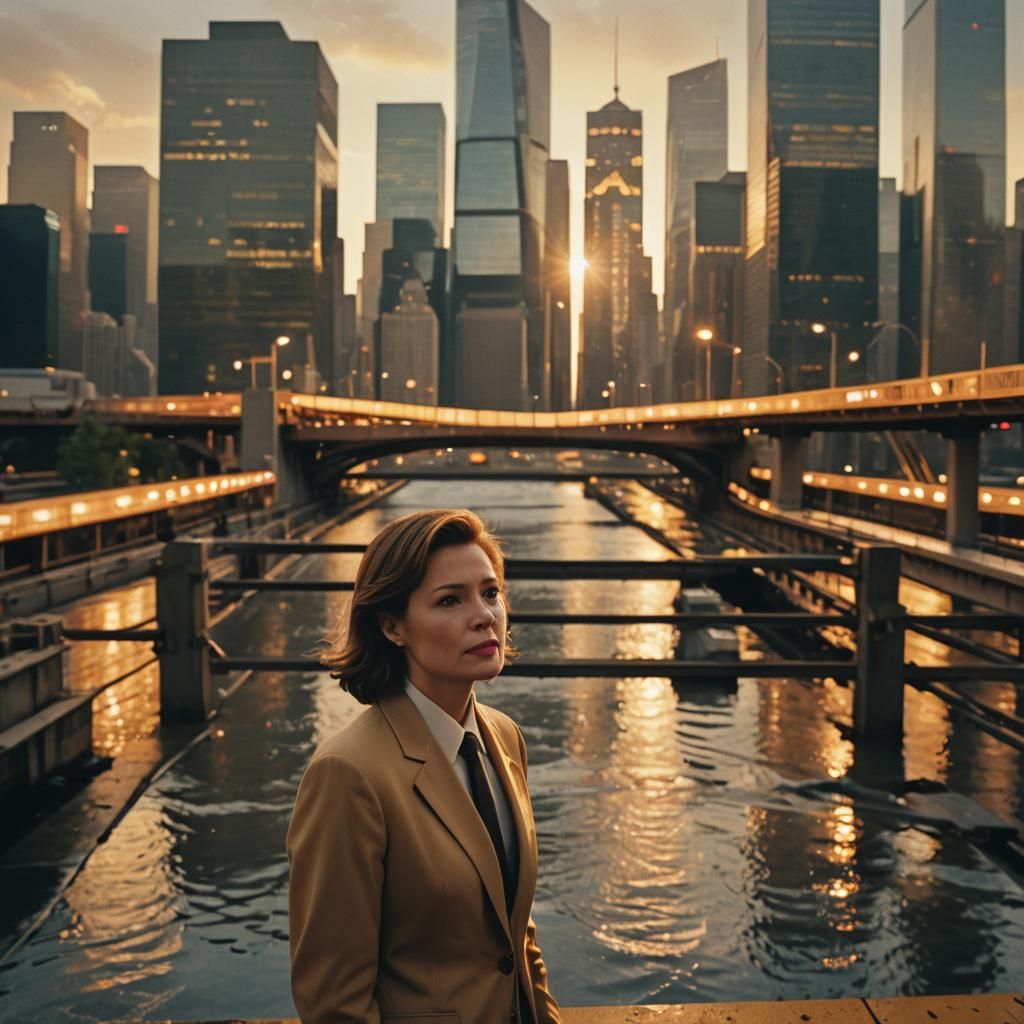 This image shows a news anchor reporting from a futuristic cityscape at sunset. The scene is bathed in warm, golden light with vibrant city lights reflecting on wet pavement, reminiscent of a cinematic film.
