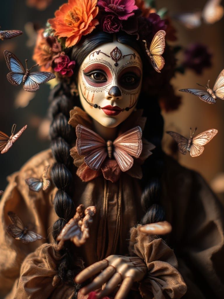 This image features a woman with vibrant Dia de Los Muertos makeup and floral adornments, surrounded by swirling butterflies in a soft-focus fantasy scene. The art style is inspired by autochrome photography and fluid motion.