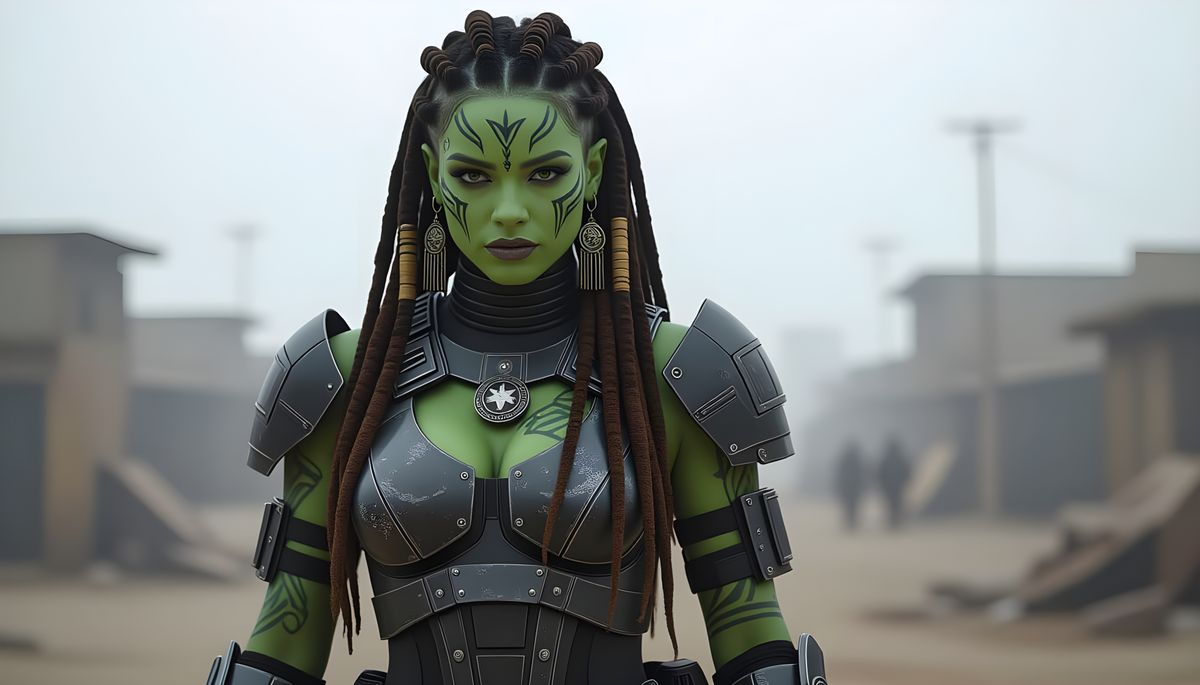 Front chest portrait of a Star Wars Mirialan female with green skin and black ritual tattoos. Her hair has Imperial charms, and she wears sleek Purge Trooper armor. Hyperrealistic and atmospheric.