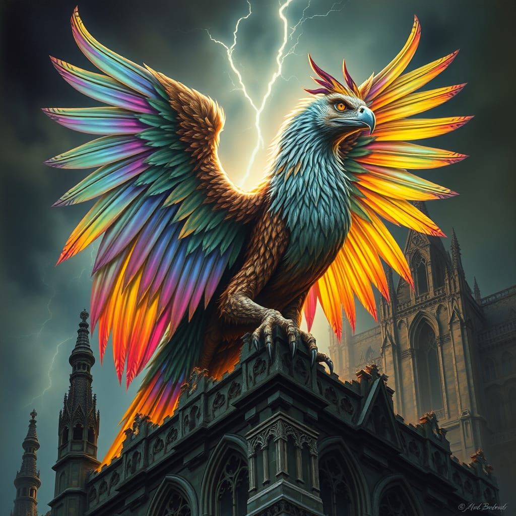 A striking picture of a griffin with rainbow feathers on a gothic cathedral. Lightning flashes behind the scene, casting shadows on the stonework in a dark fantasy style.