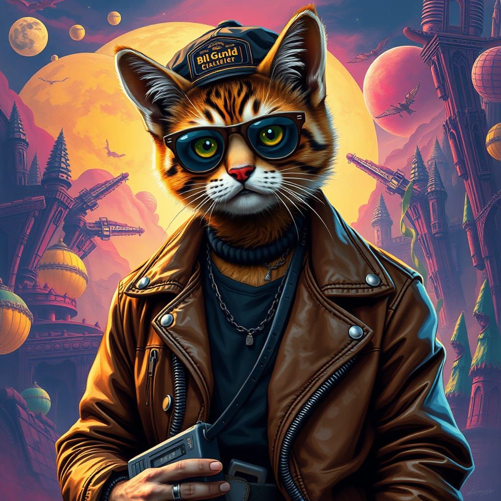 This image shows a cat with a banana haircut wearing a leather jacket, cap and walkman. The image is a vibrant matte painting with rich colors and fantastical elements, reminiscent of 70s youth rock style.