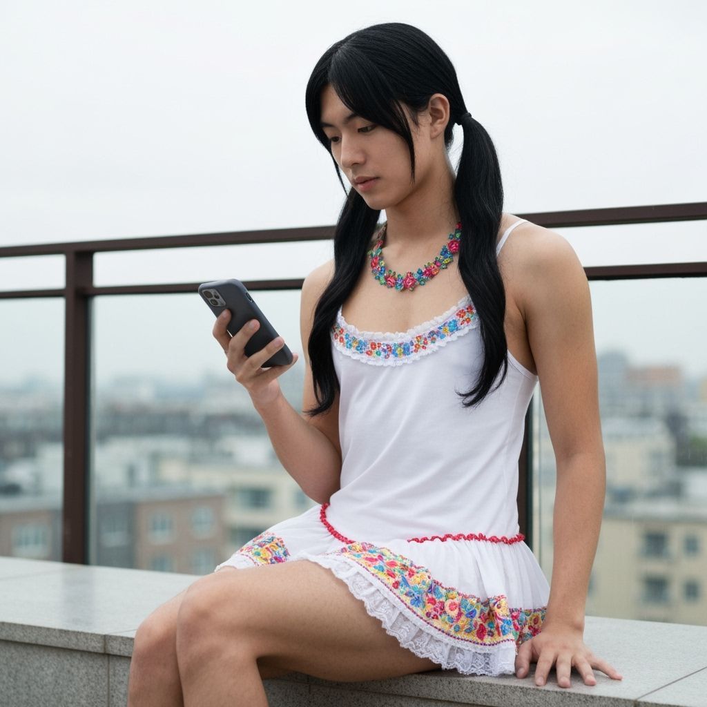 This image features a young man with long black hair in pigtails, wearing a petticoat and necklace, while sitting on a terrace and using his smartphone.