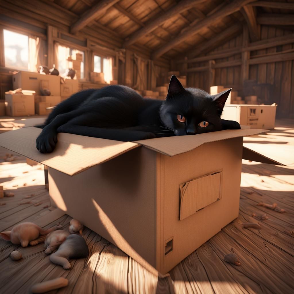 A 3D render of a black cat asleep in a cardboard box, surrounded by kittens, in a barn. The image features dynamic lighting and intricate details.
