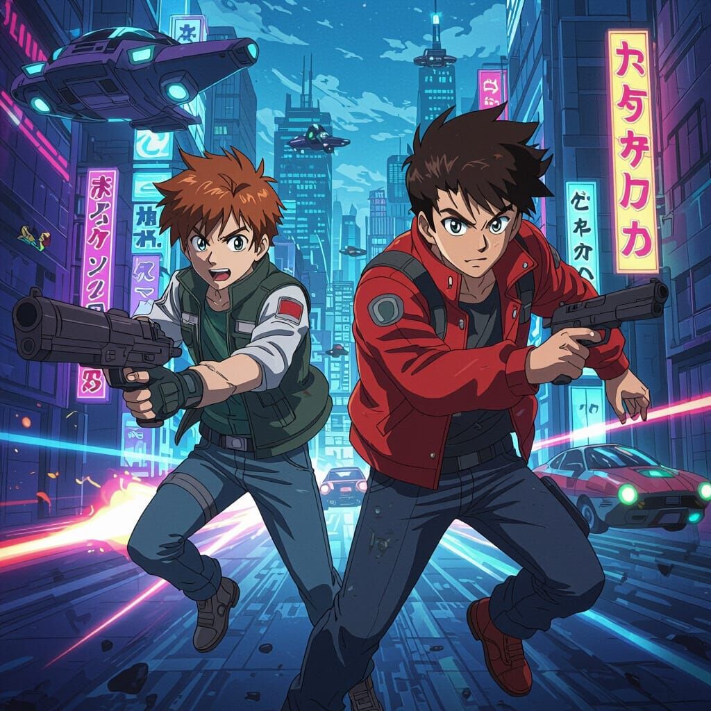 This image shows Cam and Ben in an anime style, set against a neon-lit futuristic cityscape. Featuring bold outlines, vibrant colors, and dynamic action poses, it captures a cel-shaded aesthetic with cinematic lighting.