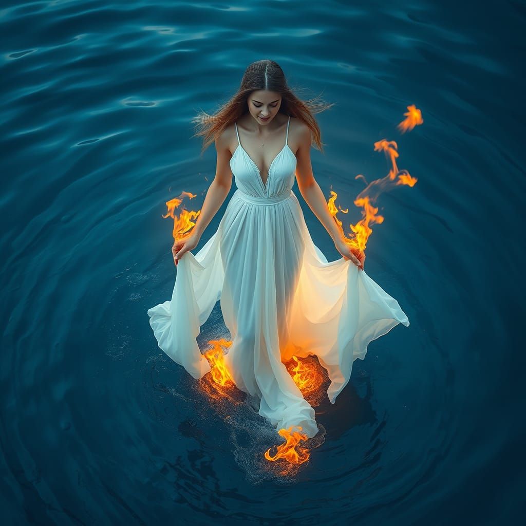 This image shows a woman in a white dress rising from blue water, with subtle flames around her, representing water and fire elements in a mystical, dreamlike atmosphere.