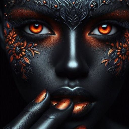 A hauntingly beautiful portrait of a woman with dark skin and striking orange eyes, surrounded by intricate black and orange flower designs in a moody, dark fantasy setting.
