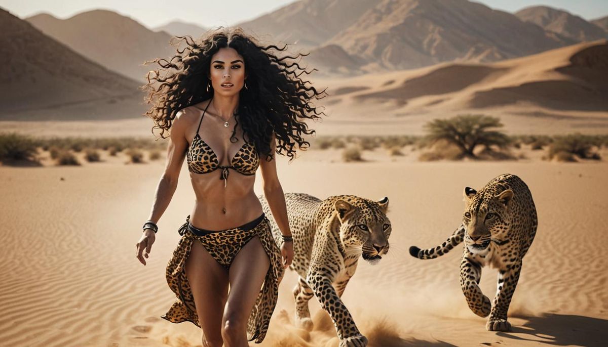 This image shows a woman with long, dark, curly hair, wearing a primitive animal-skin bikini, running across a desert landscape chasing a leopard. The scene is illuminated by bright sunlight.