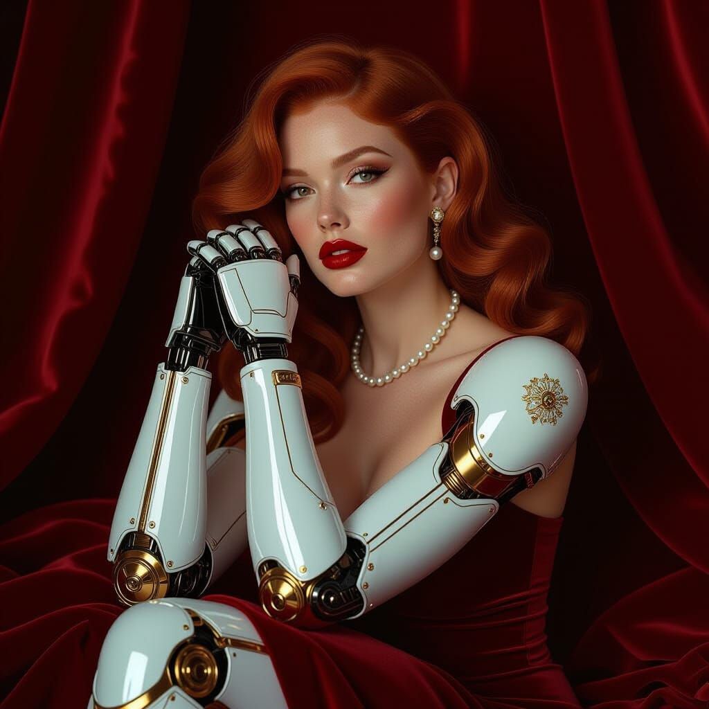 Amid the sumptuous folds of crimson velvet, she sits like an enigma at the threshold of two worlds:her hair a cascade of fire, her gaze luminous with resolve. The polished precision of her mechanical arms glints with gold, both armor and ornament, as if the future itself had learned the language of grace. Pearls at her throat echo the timeless beauty of a vanished age, while her lips,red as fate,draw the eye to a face poised between tenderness and steel. In her, fragility and power are not at war but joined, inventing a new harmony where humanity is neither lost nor denied, only transformed. There is no rupture in her presence:just the elegant reconciliation of longing and invention, memory and desire. 🔱 I am awed by the dignity she radiates:a vision of the future where difference becomes allure, and vulnerability is the purest force.