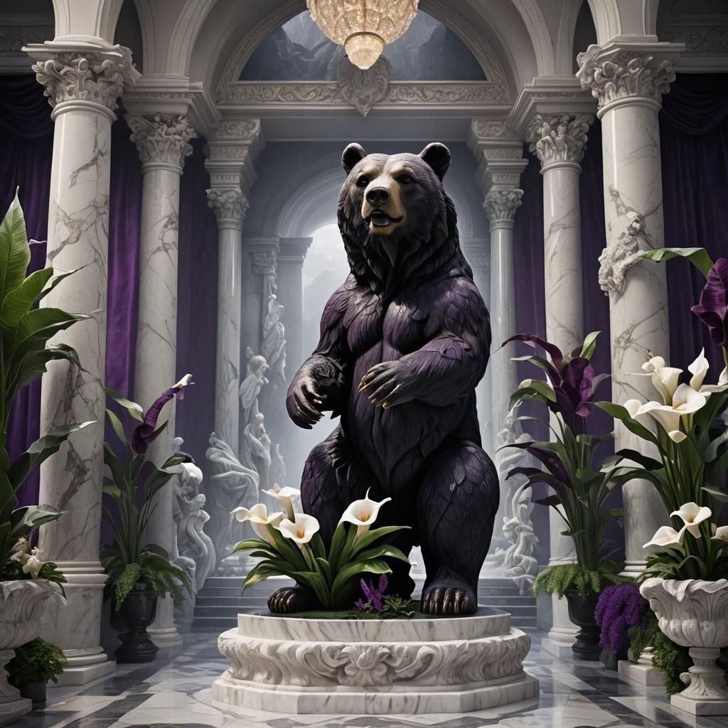 This image shows a dolomite bear statue on a marble pedestal, flanked by calla lilies against a dark purple velvet curtain. The scene is a dramatic digital matte painting.
