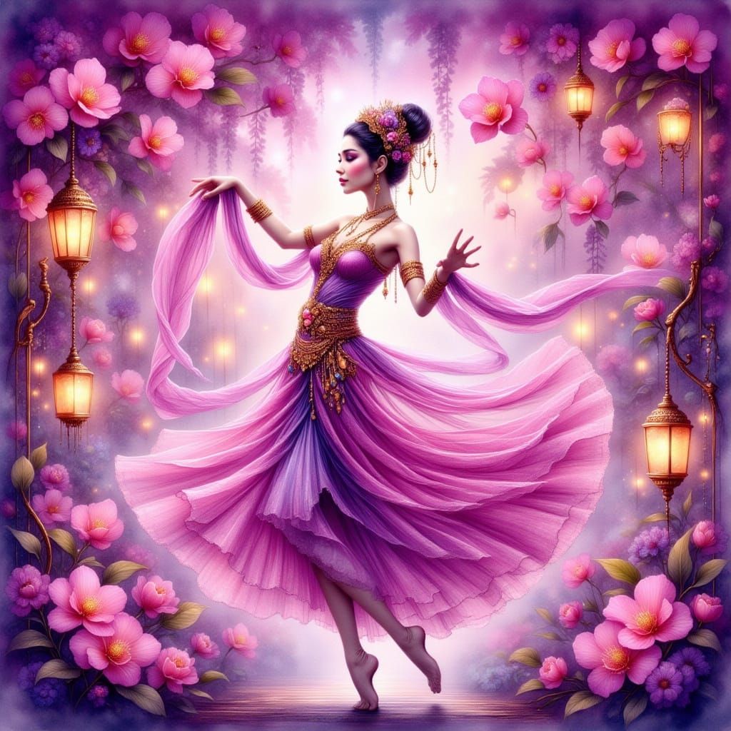 A dreamy watercolor image of a radiant Thai woman performing a classical dance in a lush garden setting, surrounded by vibrant pink and purple hues and delicate orchids.
