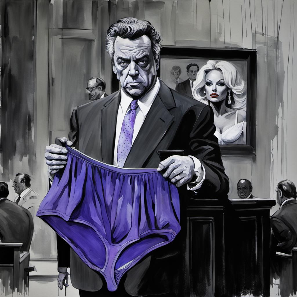A watercolor painting of Perry Mason in a courtroom, holding purple underwear with a confused expression. This image combines impressionist and street art influences with mixed media and vibrant colors.