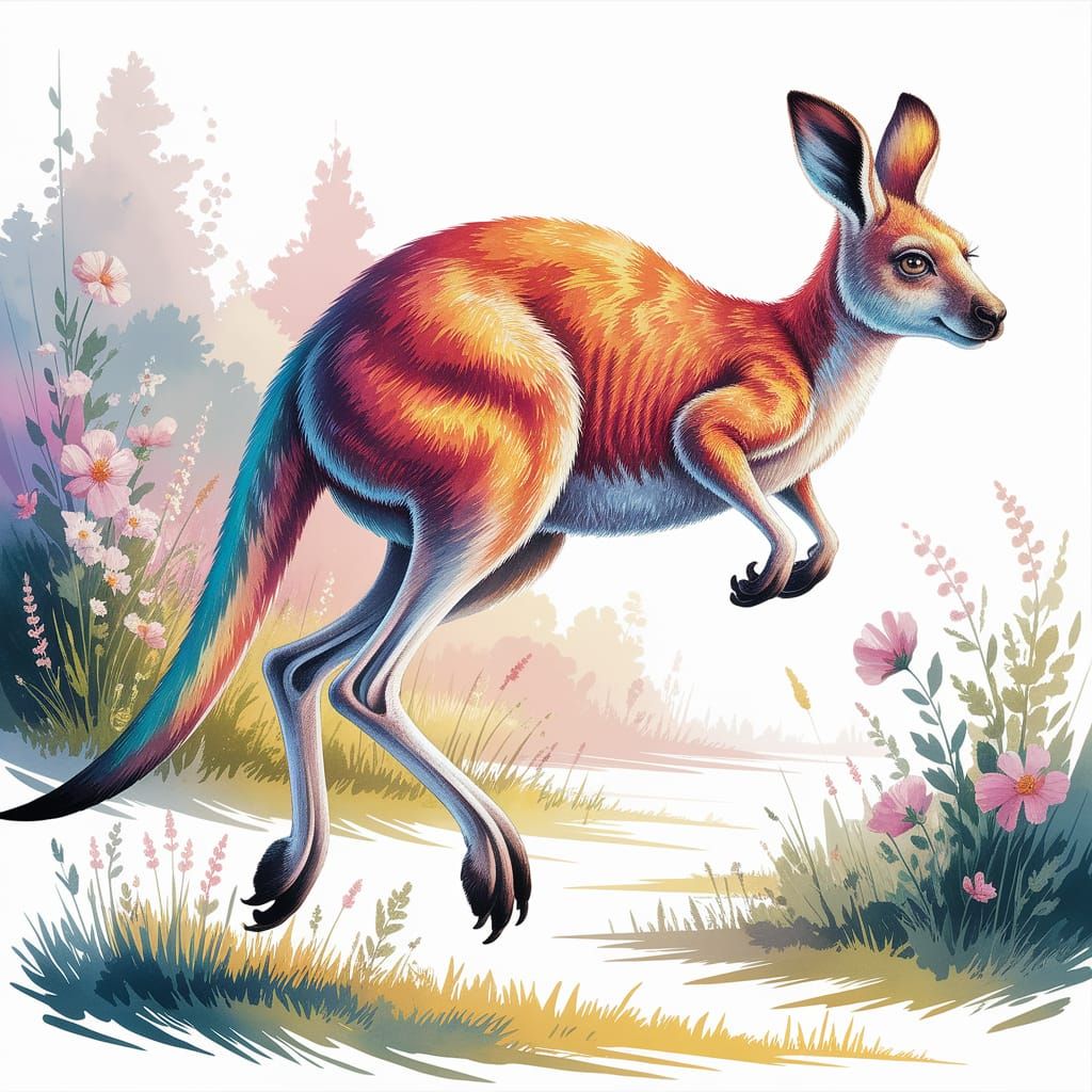 This image shows a kangaroo with bright, colorful fur jumping across a sunny meadow. The soft, whimsical background is filled with wildflowers and grasses, rendered in watercolor.