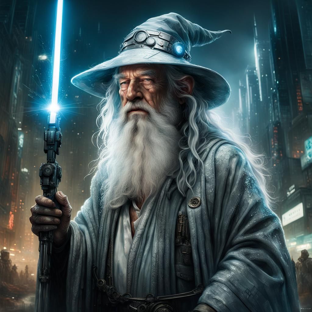 A striking picture of a robot wizard in a cyberpunk aesthetic. The figure, illuminated by moonlight, wields a laser wand in a hyperdetailed, cel-shaded digital painting.