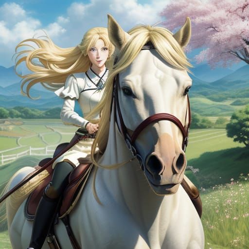 This image features a beautiful blonde woman on horseback, rendered in a detailed Japanese manga style with bright, vibrant lighting. It's a close-up illustration perfect for anime fans.