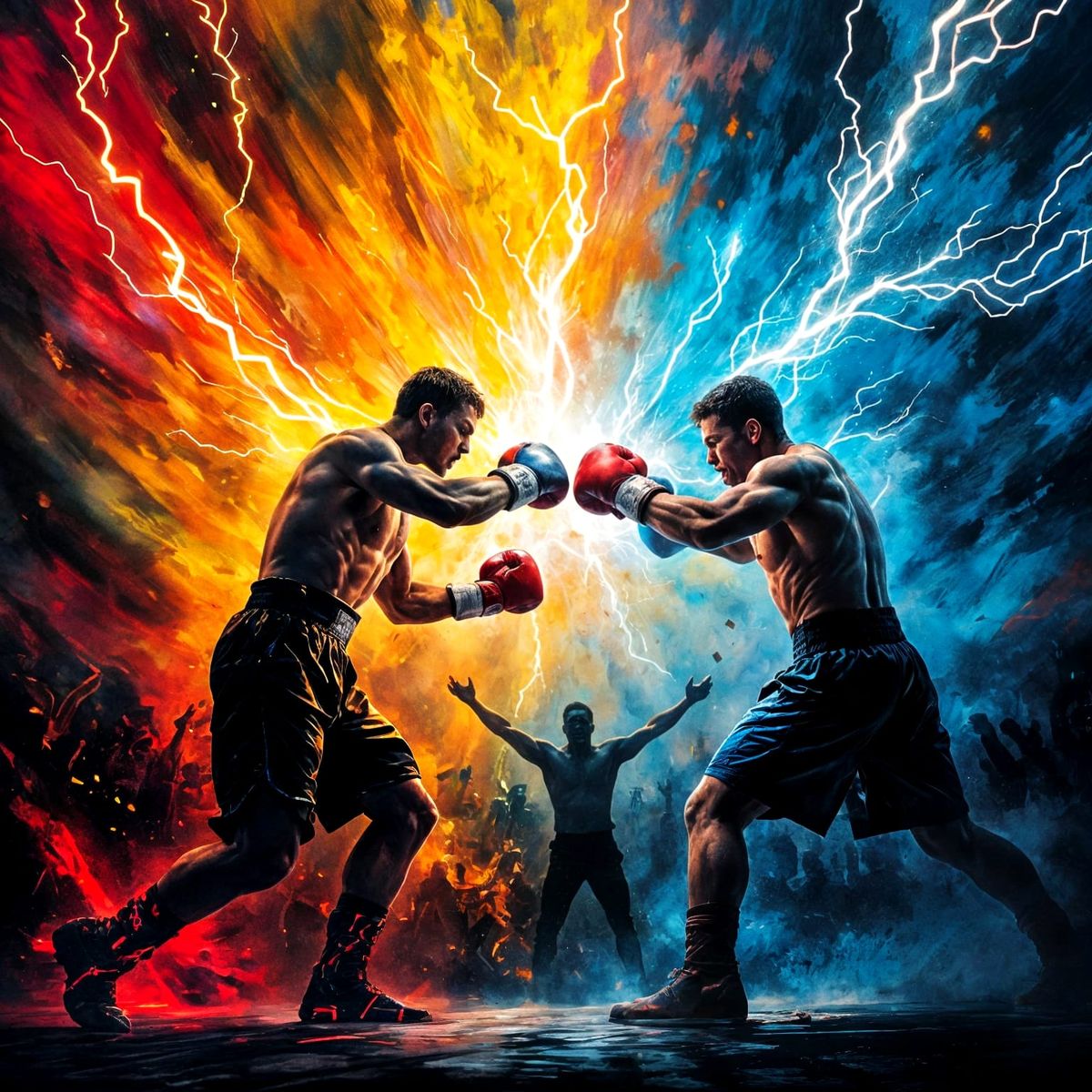 This image shows two boxers exchanging fiery, lightning-infused blows mid-fight, set against a vibrant backdrop of cheering crowds rendered in a street art style. The scene is captured with saturated colors and deep shadows.