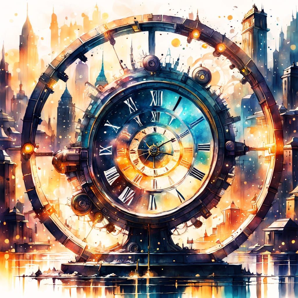 This AI-generated image depicts clocks transforming into a portal between eras, rendered in a vibrant, dreamy watercolor style with soft brushstrokes and warm lighting.