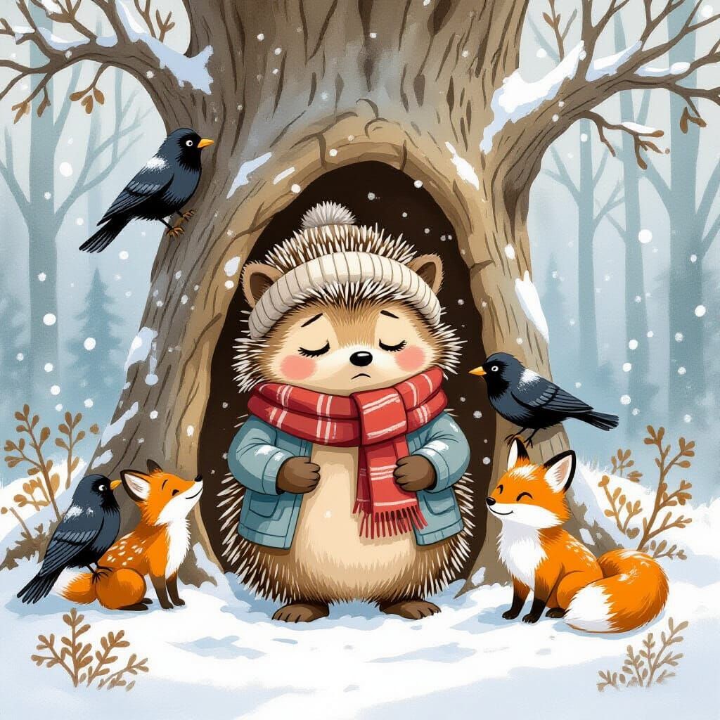 This image shows Harun the Hedgehog looking sad outside his tree, supporting the weight of his friends. Soft snowflakes fall in this watercolor illustration with cold blue and warm brown tones.