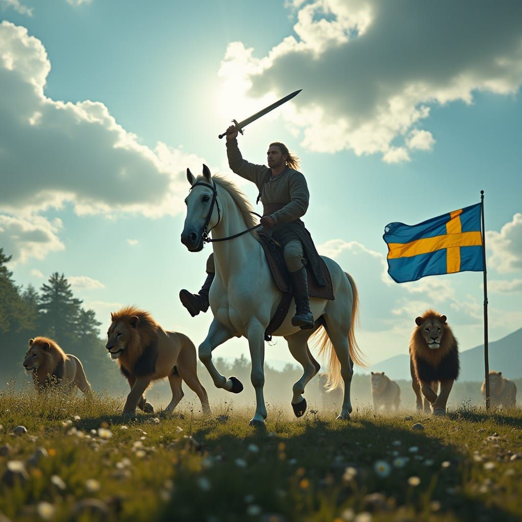 This image shows a blonde man on a white horse charging forward, sword raised. Lions flank the horse against a dramatic sky. A Swedish flag waves over a vibrant green pasture, rendered photorealistically.