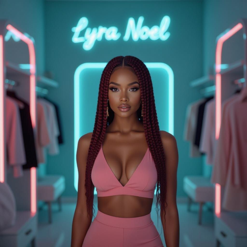 This image features a cinematic, ultra-realistic depiction of an influencer's fashion room. It showcases coral and teal LED lighting, outfit racks, mirrors, and a glowing neon sign.