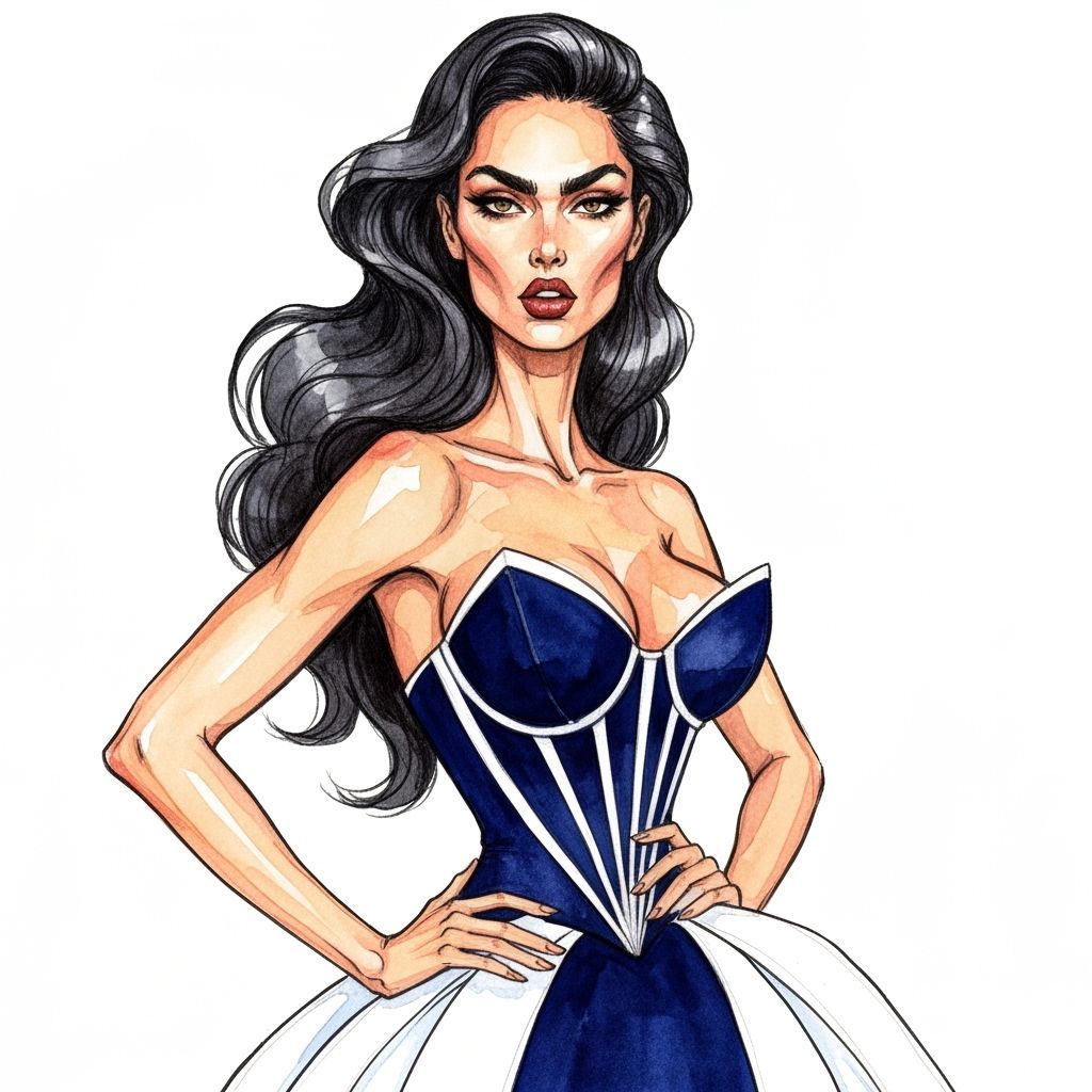 This image showcases a striking Latina woman in a couture gown, rendered with expressive watercolor washes and delicate pencil lines. The artwork captures her confident and alluring presence.