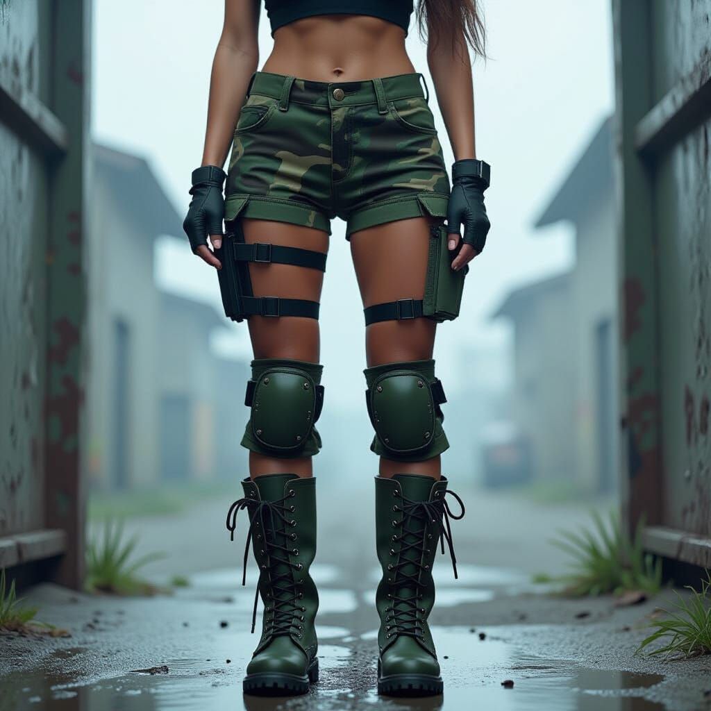 This image shows a woman in army boots and camouflage in a military setting. It's rendered with a gritty, high-contrast aesthetic, reminiscent of noir-inspired digital art.