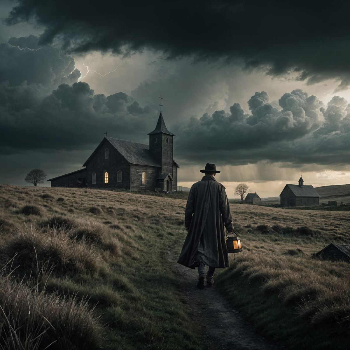 This image shows a lone, cloaked figure with a lantern on a moor under a stormy sky. A barn and distant village add to the sinister, cinematic atmosphere in vintage style.