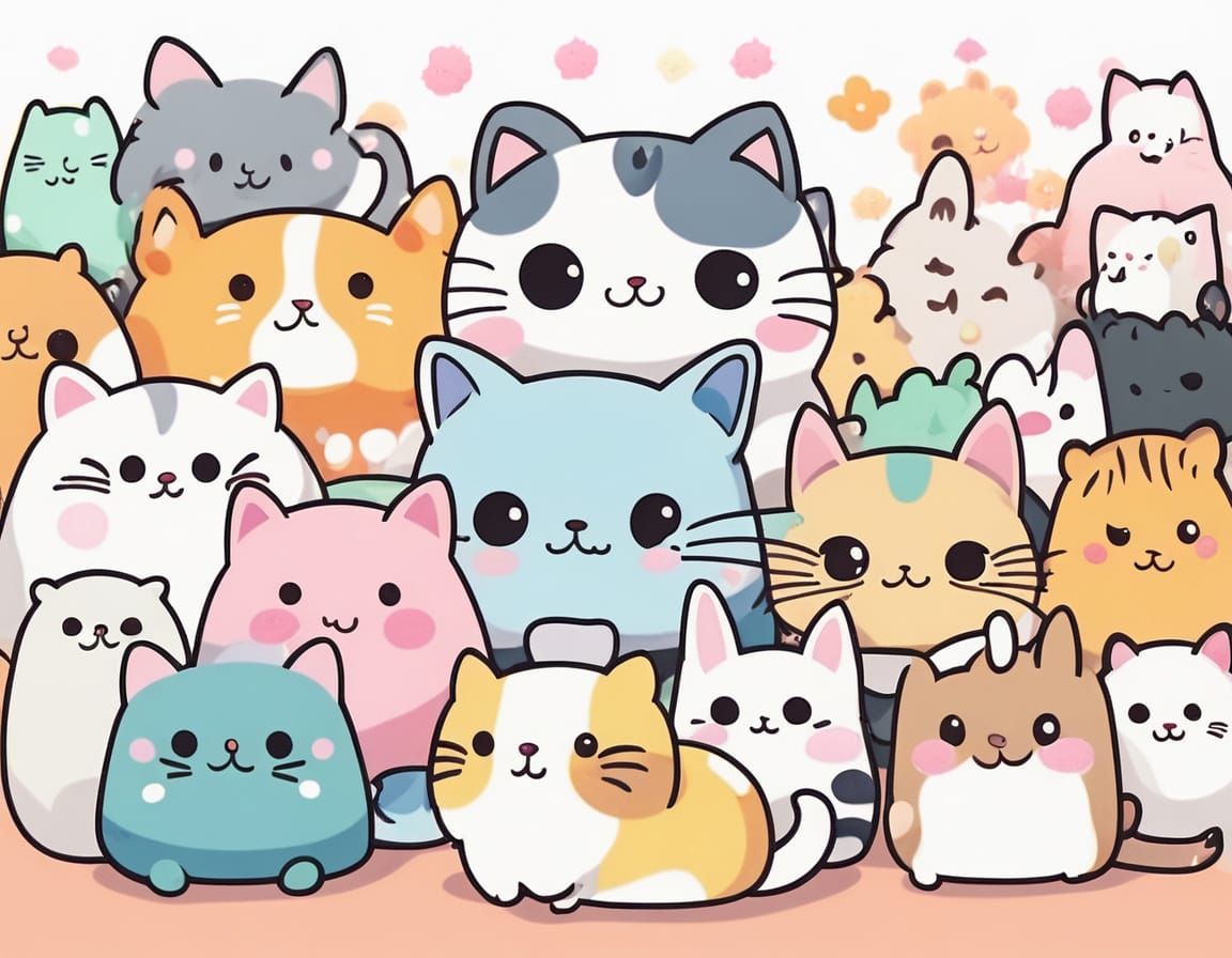 This image shows a cat in a Japanese kawaii anime style, surrounded by other small, cute kawaii animals. The image captures the essence of Japanese pop culture.