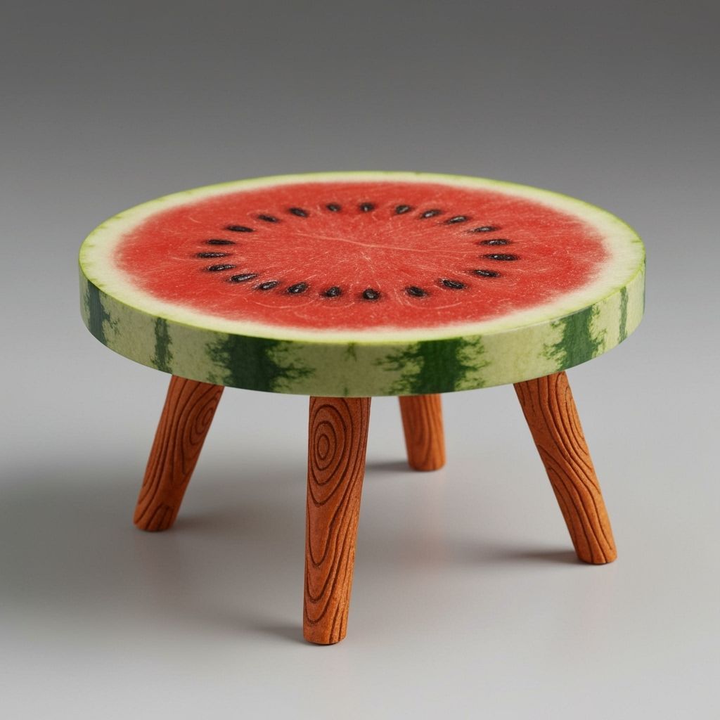 A hyperrealistic still life of a miniature coffee table. The table features a watermelon slice tabletop and carrot legs with wood grain textures, rendered with sharp focus and realistic lighting.