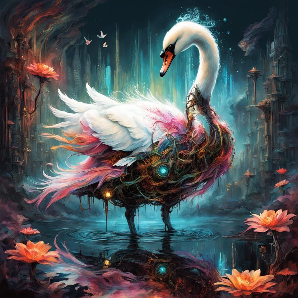 A hyper-realistic digital artwork of an ethereal white swan with glowing feathers dancing on a mirror-like lake, set against a backdrop of vibrant colored mist and neon circuit patterns.