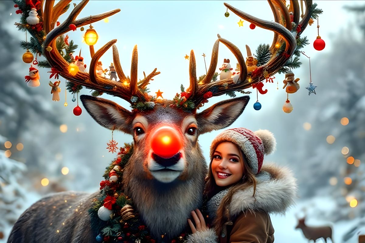 A majestic deer, dressed in a warm winter coat, facing the viewer at a slight angle with a big bright red glowing clown nose, adorned with a full rack of antlers beautifully decorated with sparkling LED lights and vibrant Christmas ornaments including angels, snowmen, snowflakes and icicles, stars, ...