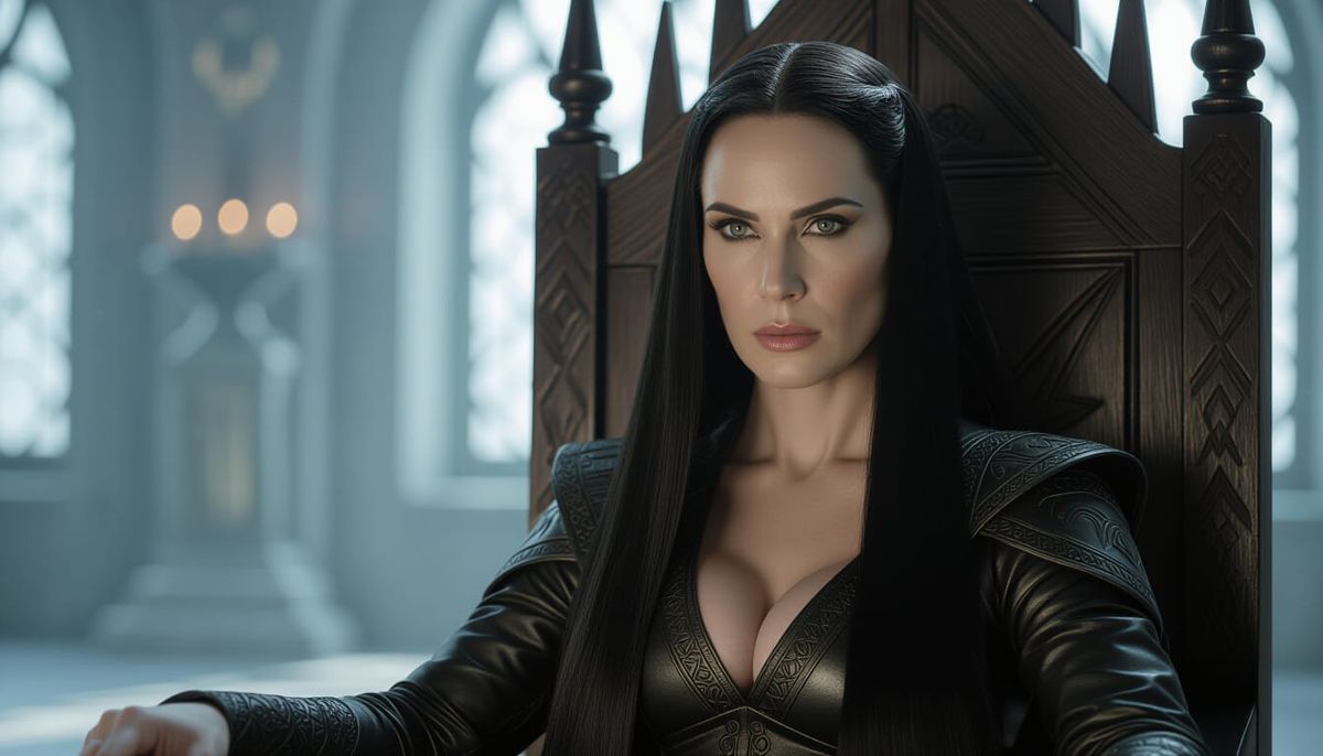 A regal woman with dark hair is enthroned in a cinematic portrait. The image features film grain and a subtle vignette, enhanced by dramatic lighting and meticulous color grading.