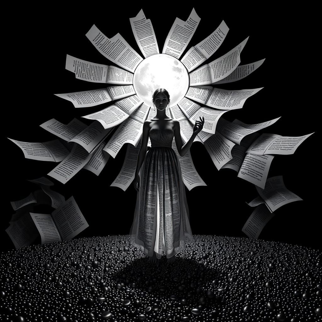 This image shows a dreamlike, otherworldly landscape with a colossal cliff suspended in mid-air, composed of pages from unknown languages that turn slowly in the wind. A dark figure with a transparent mask and sightless eyes stands at the center, surrounded by galaxies dancing in her gaze, while behind h...