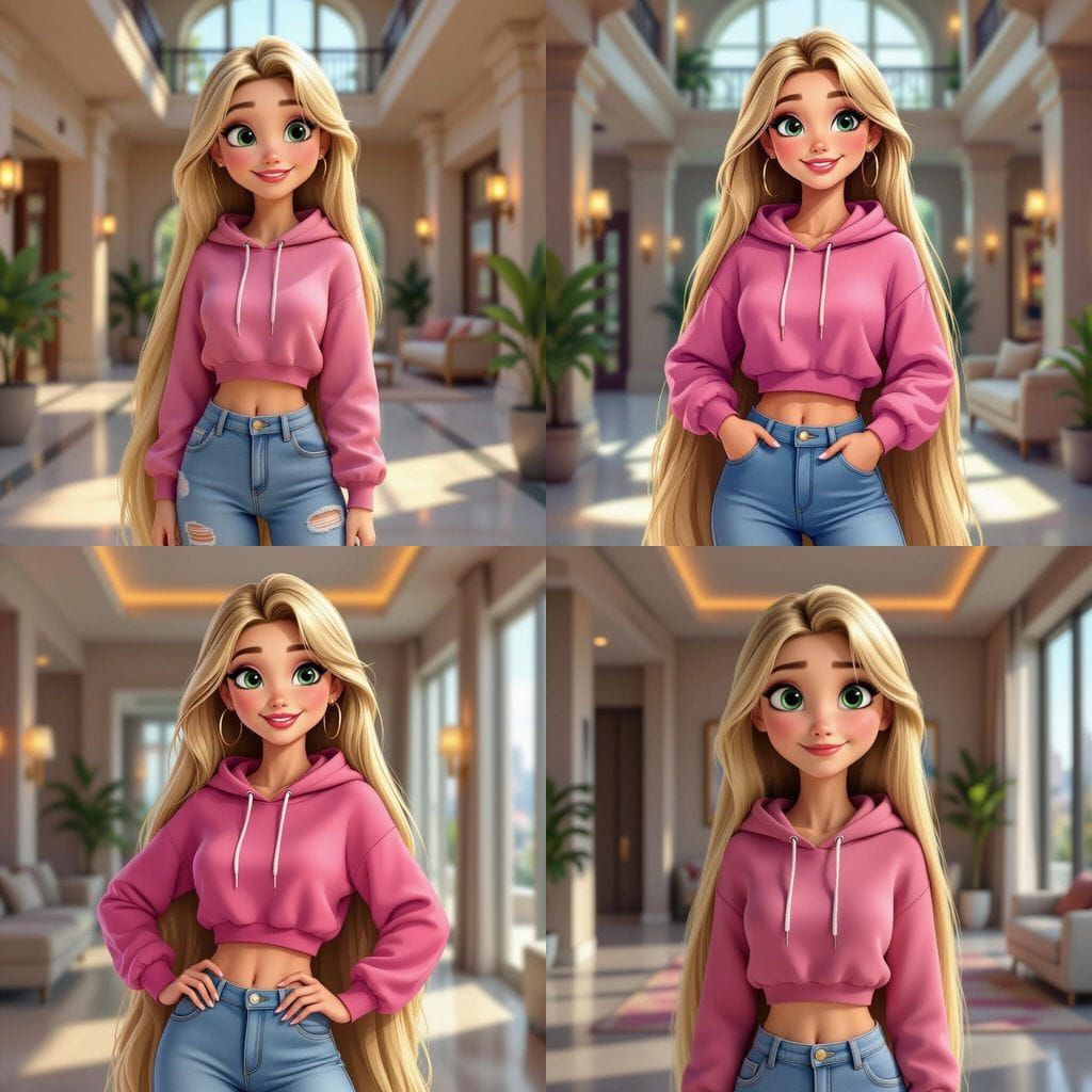 This image shows an adult Rapunzel with blonde hair, wearing a pink hoodie and blue pants, with a smug expression in a high-end apartment. Rendered in 3D cartoon art style.