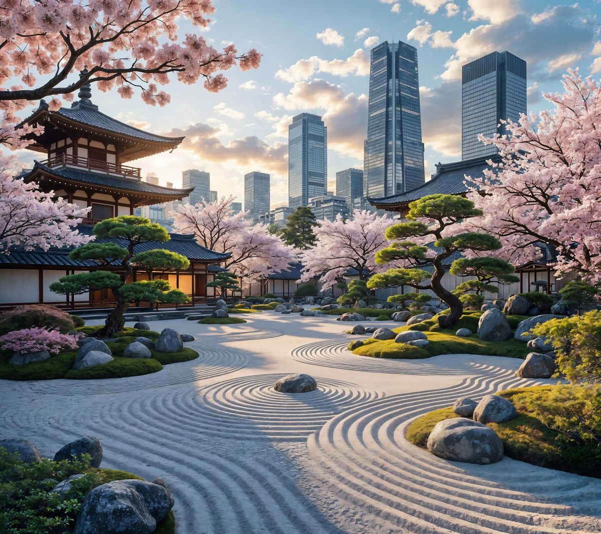 A breathtaking digital artwork of a serene zen garden in a futuristic Kyoto, Japan