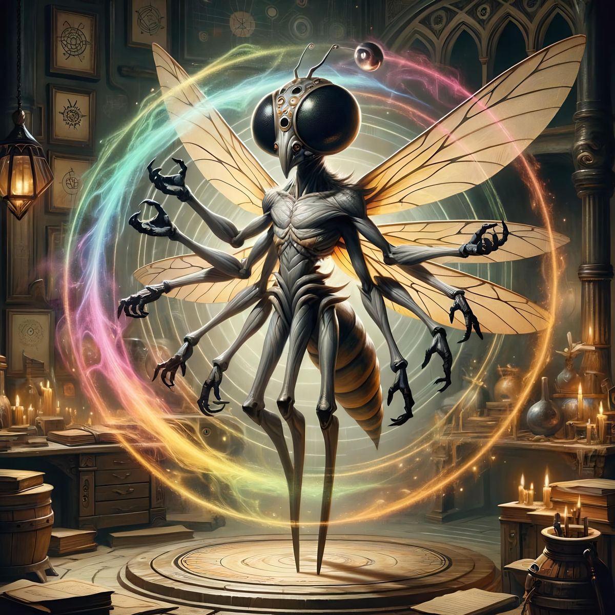 A striking picture of a six-armed spell craftsman in an arcane laboratory. The otherworldly character is holding a multicolored disk, surrounded by magical energies. The image is in a fantasy art style.