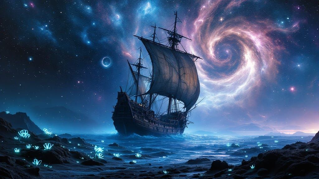 This image shows a lone, weathered pirate ship sailing through a stardust nebula. An alien landscape with glowing plants is below, bathed in ethereal light casting dreamlike shadows. Evokes grand adventure.