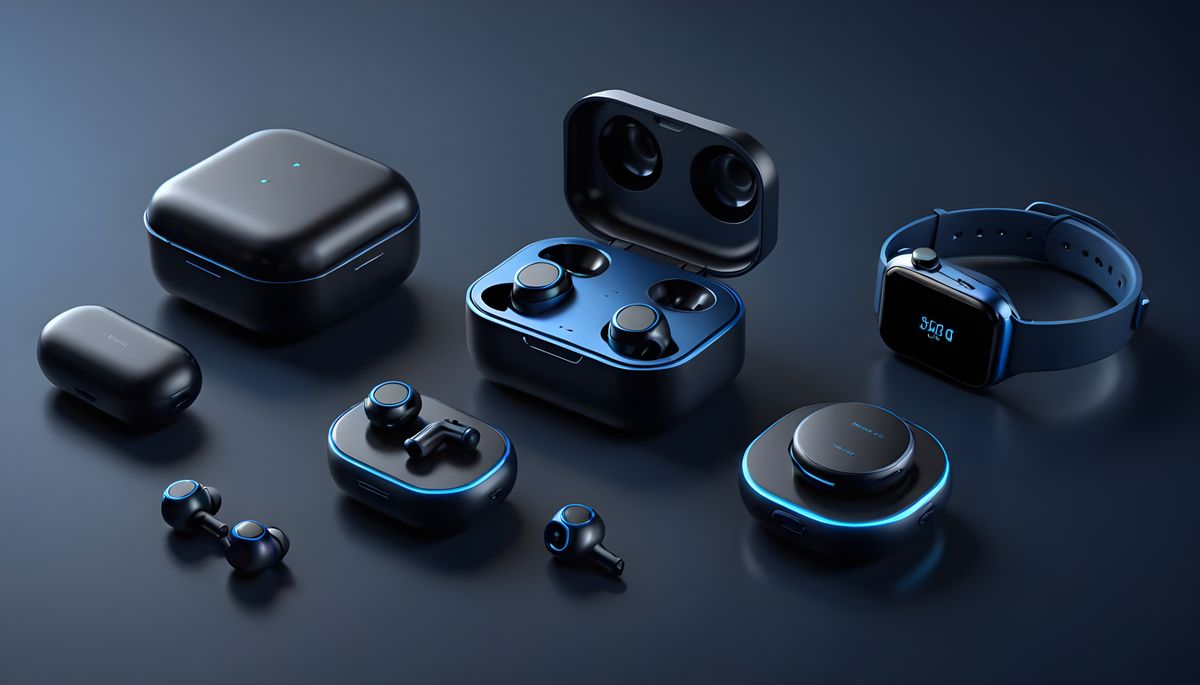 This image shows a banner design for a tech accessories brand. Premium gadgets such as earbuds and smartwatches float against a futuristic gradient backdrop with neon accents, rendered with photorealism.