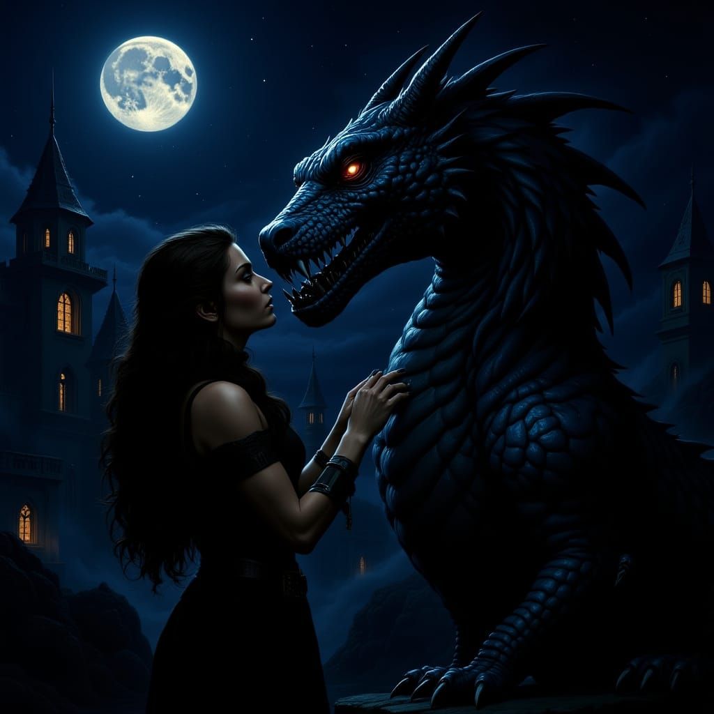 This dark fantasy art depicts a woman bonding with a majestic dragon before a castle under a starlit sky. Atmospheric lighting and deep colors create a dramatic scene.