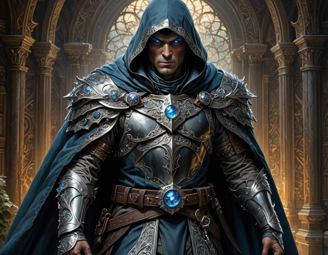 A hyperrealistic image of a cloaked rogue with grey skin, black silver shoulder armor, and blue eyes. The character is rendered with intricate details and high contrast, in a fantasy art style.