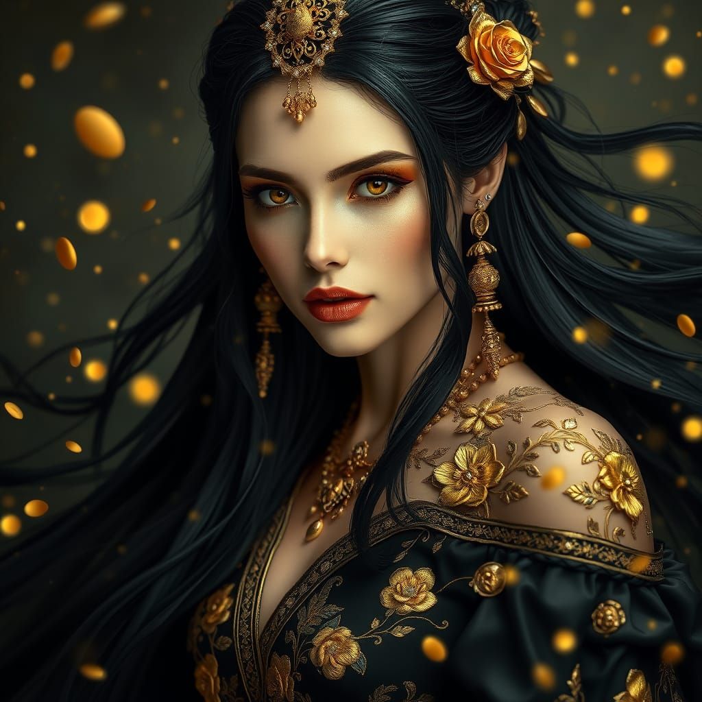 A striking picture of an empress in a black silk gown with gold embroidery. The portrait features detailed fabrics, jewelry, and skin texture with cinematic lighting, in a majestic aesthetic.