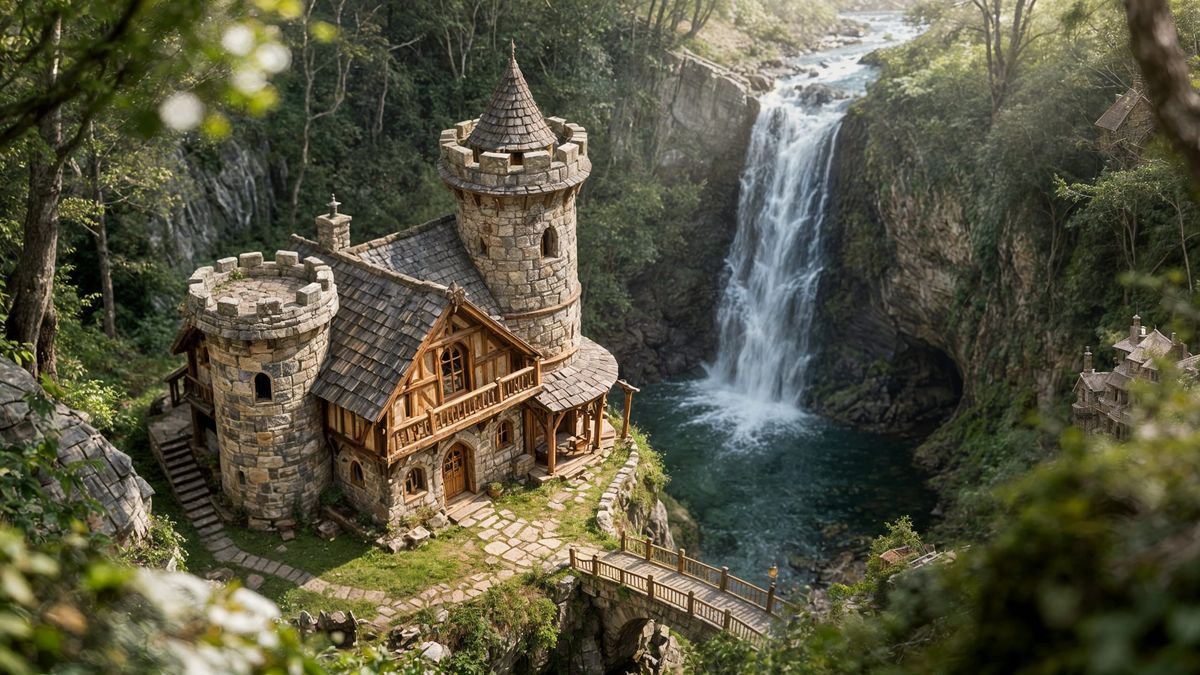 This image showcases a rustic elven cottage with castle-like round towers, nestled in a wooded gorge beside a waterfall. Captured with professional photography techniques for sharp focus.