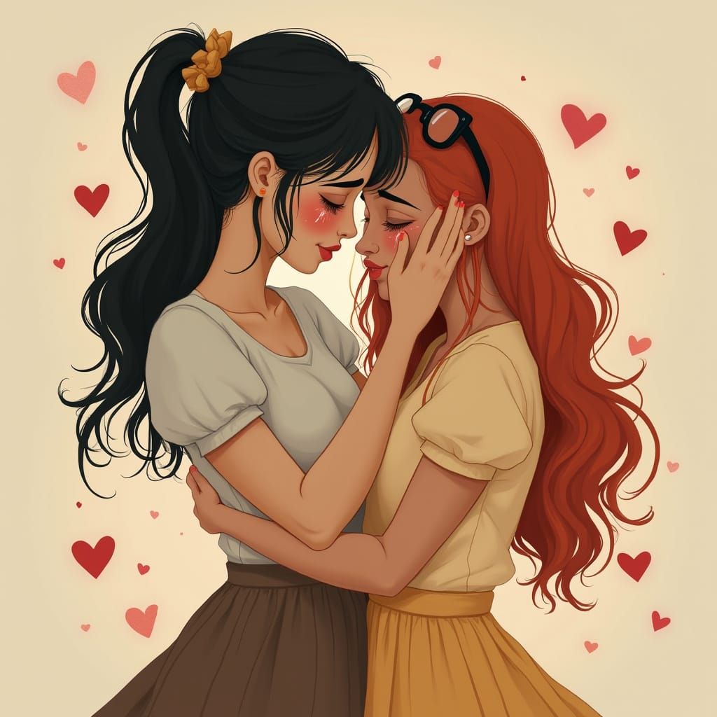A realistic photo of two women embracing tenderly. One woman with dark hair comforts her red-haired lover, both depicted with soft features in warm, pastel earth tones and heart accents.